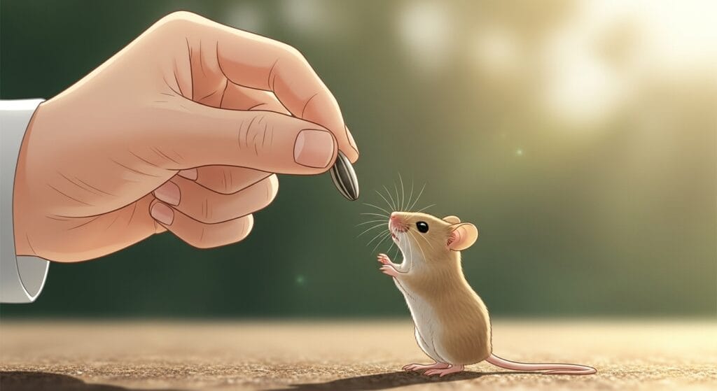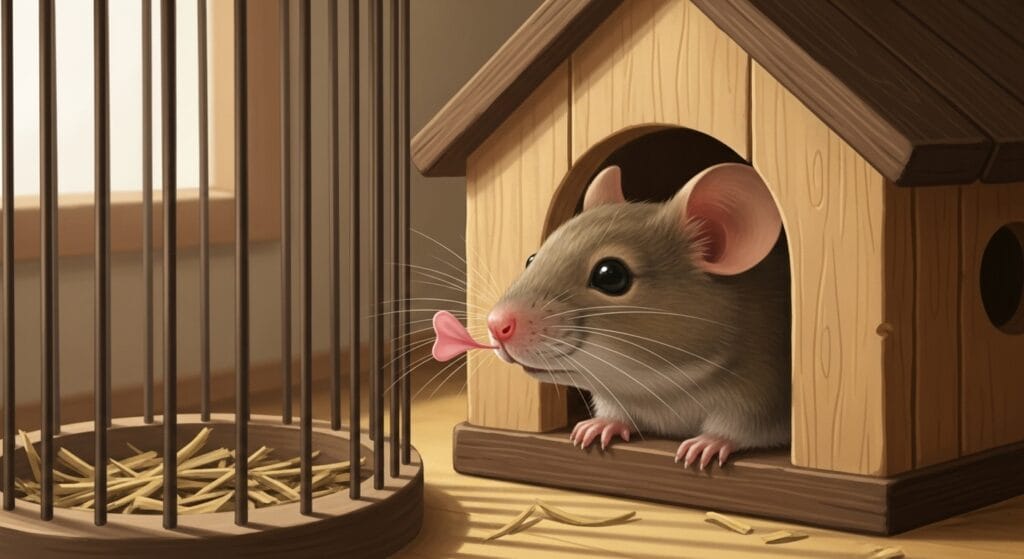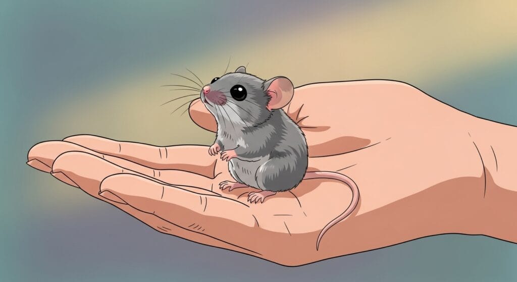 ハツカネズミくんは、基本的にはとってもビビり屋さん。野生の世界では天敵が多いから、物音にはすごく敏感なんだ。最初はケージの隅っこに隠れちゃうかもしれない。