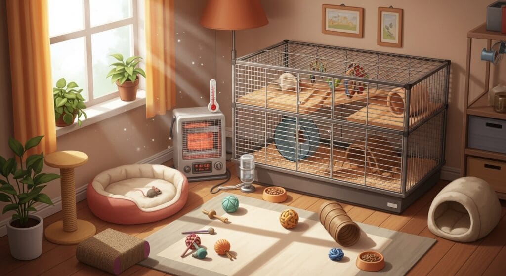 ハツカネズミは寒さにも暑さにも弱いです。理想は、人間が「あ、快適だな」と感じる20度から26度くらい。冬はペット用のヒーター、夏はエアコンでしっかり温度管理をしてあげてくださいね。