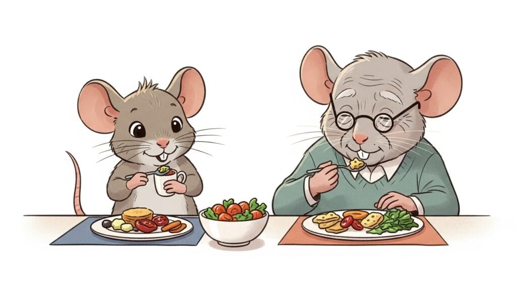 ハツカネズミの一生は、人間と比べるとすごく短いんだ。生まれてからおじいちゃん・おばあちゃんになるまで、あっという間。だから、その時々に合わせたごはん選びが重要になってくるんだよ。