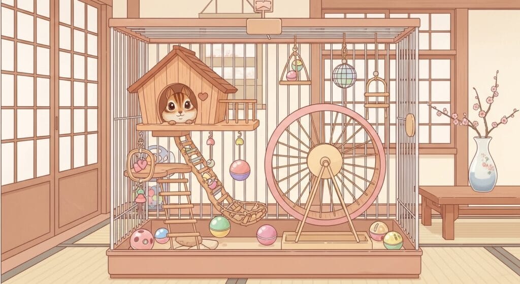 シマリスはとっても活発で、上下にピョンピョン飛び跳ねるのが大好き。だから、ハムスター用の小さいカゴじゃなくて、高さがある「リス・モモンガ用ケージ」が必要です。 だいたい10,000円〜20,000円くらいで見積もっておきましょう。