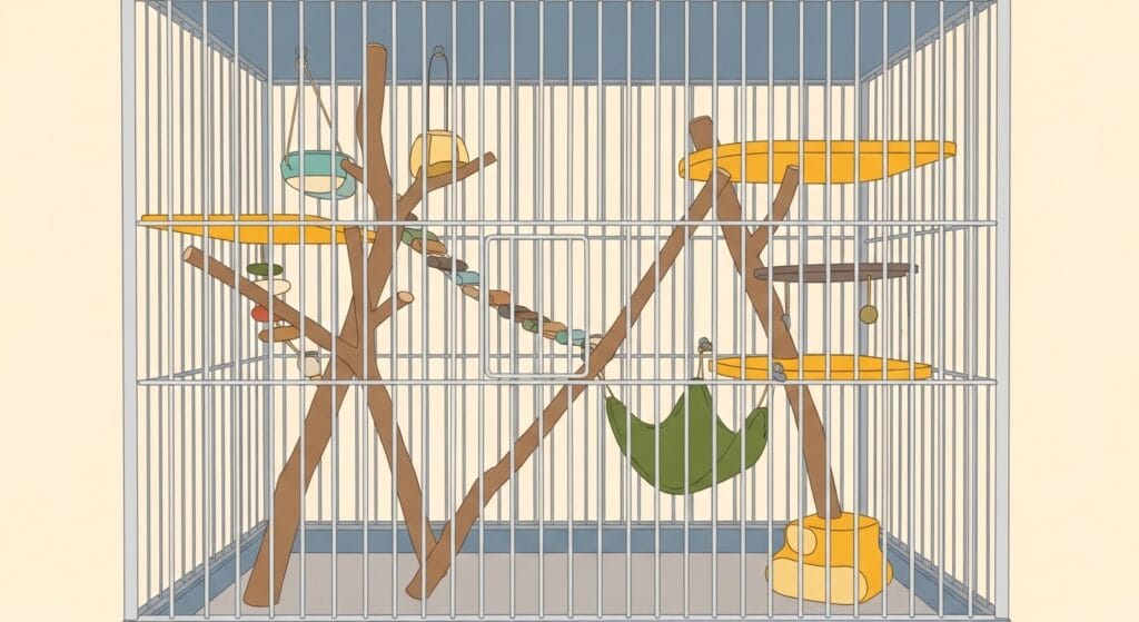シマリスは上下に動くのが大好き。だから、ハムスター用の横に長いケージじゃなくて、鳥かごみたいに「背が高いケージ」を選んであげて。最低でも高さが60cmから80cmくらいあると、シマリスも「ひゃっほー!」って上下に飛び跳ねて遊べるよ。