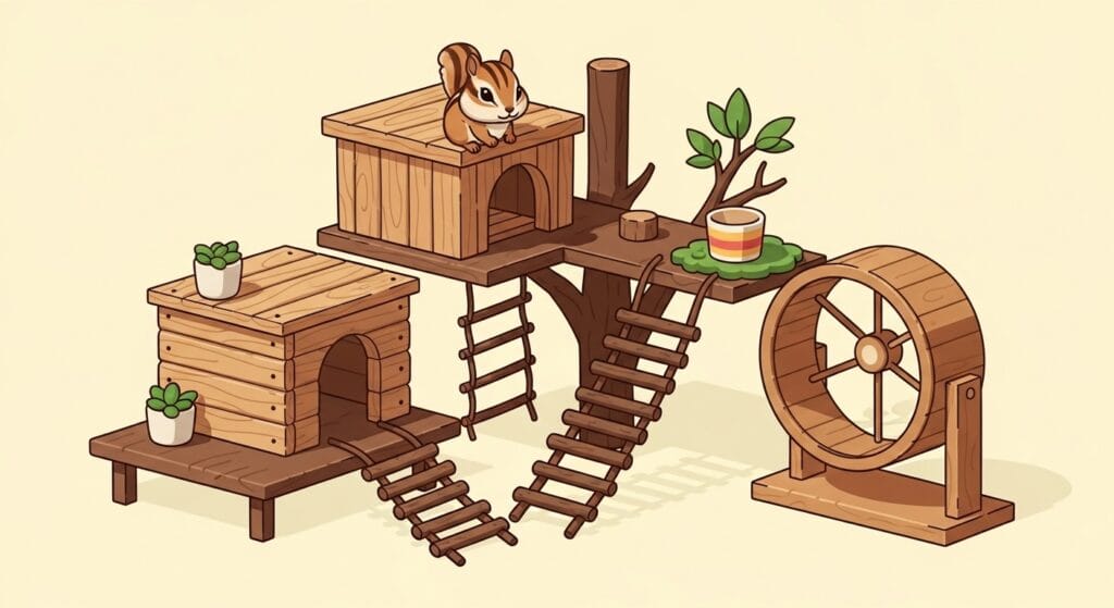 シマリスは地面を走るのも好きだけど、木に登るのも大好き!だから、ハムスター用の低いケージじゃなくて、高さがあるケージを選んであげてね。シマリスが「ぴょーん!」って飛び跳ねてもぶつからないくらいの高さがあると、彼らも大喜びです。