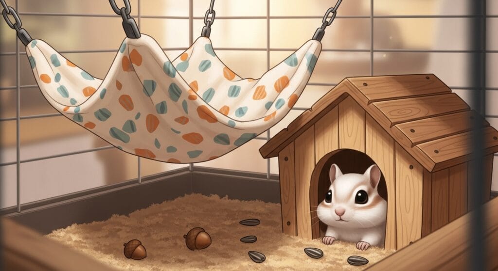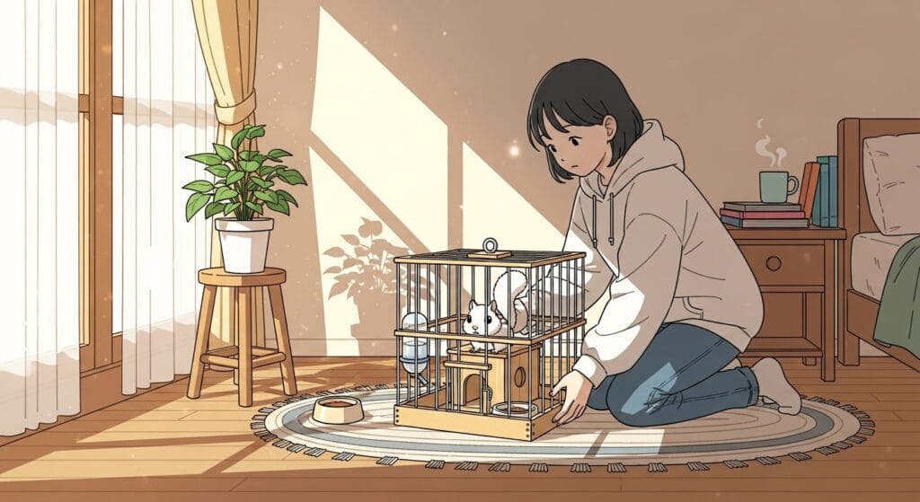ケージの中のレイアウトをコロコロ変えちゃうと、リスくんが「あれ?ここに足場あったはずなのに!」ってパニックになるから、一回決めたらなるべく変えないであげるのが優しさだね。