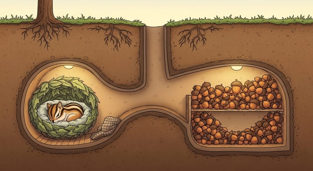 特に冬の間、外が氷点下になっても、地下の深いところにあるお部屋は温度が安定しているんだ。そこでたくさんのどんぐりに囲まれて、春が来るのをじっと待つ。生息地の厳しい冬を乗り越えるための、最高の知恵なんだよ。