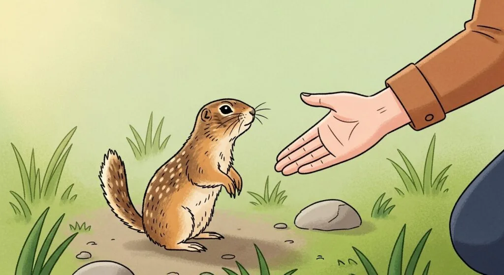 野生のリチャードソンジリスは、地面に穴を掘って生活していて、常に空から天敵に狙われている環境で生きています。だから、本能的に「上から来るもの」や「急に動くもの」に対して、すごくビビりなんです。