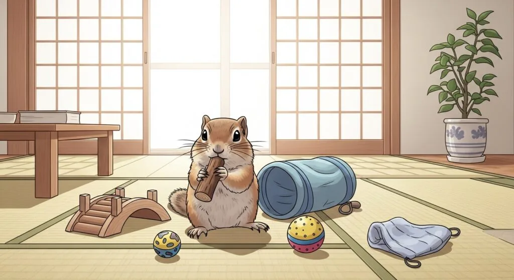 リチャリスをケージから出して遊ばせる「部屋んぽ」。これ、めちゃくちゃ楽しい時間なんですけど、彼らは「かじるプロ」です。