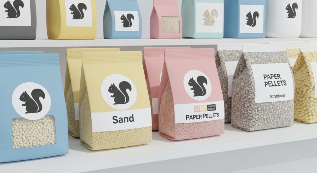 おすすめは、小動物用の「紙の砂(ペーパーペレット)」や「消臭砂」。これなら安心だし、吸水性もバッチリです。また、トイレシートを敷く場合は、中身のゼリーを食べてしまわないように、必ずメッシュの下に敷いて、リチャリスの手が届かないようにしてくださいね。