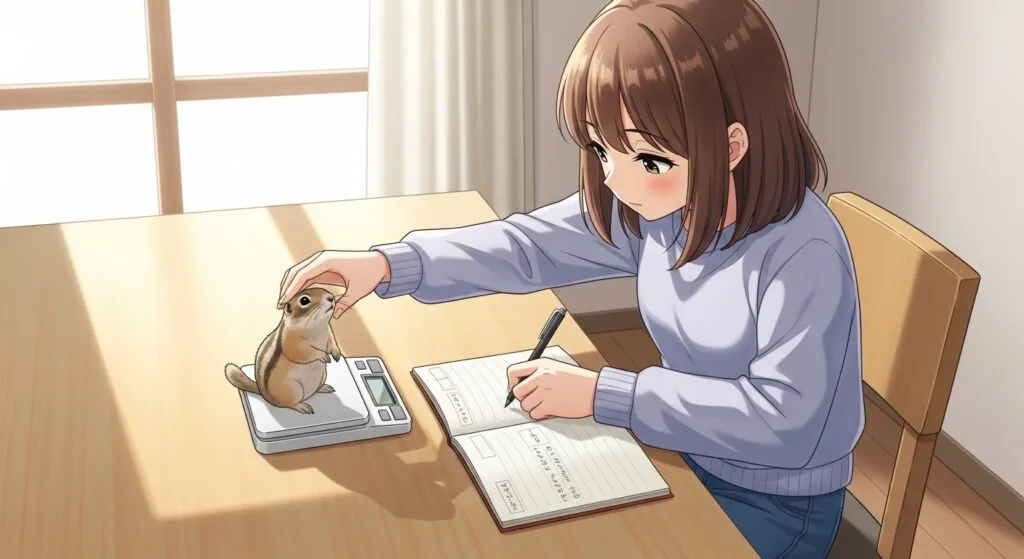 キッチンスケール(はかり)の上にカゴを置いて、その中にリチャリスを入れて体重を測る習慣をつけましょう。毎週同じ時間に測って記録しておくと、体調の変化にいち早く気づけますよ。